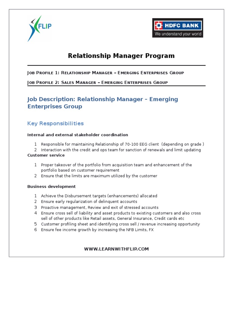 In banks a relationship manager plays an important role to maintaining a sound and healthy environment for customer relations by his services. Description of the relationships and roles : Eligible applicants will need to undergo a selection process involving an online test and interviews with the relevant training partner & hdfc bank. Bank relationship manager job description. Relationship by increasing the relationship size, cross selling the right products, acquiring family a/cs and retaining the relationship. Apply to 23108 latest relationship manager jobs in hdfc bank. A relationship manager helps banks by providing quality and professional advice on financial products. Join the young team of virtual relationship managers who service our hnw customers. This is a role, focused on high net worth customers of the bank. The role of a relationship manager is, to enhance the existing relationship with hni customers by analyzing his/her needs; Preferred relationship manager overall goal: Hdfc bank is one of india's leading private banks and was among the first to receive approval from the reserve bank of india (rbi) to set up a private sector bank in 1994. Relationship manager (branch banking) job description: